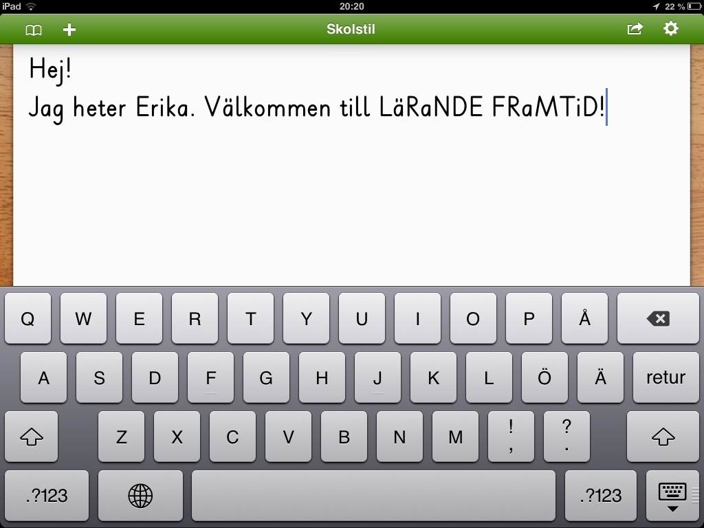 Blev tipsad om appen skolstil som är toppen både för äldre barn som knäckt läs/skrivkoden eller de som är på väg att knäcka den. Du skriver bokstäverna och en röst ljudar varje bokstav, när du sedan gör mellanslag läser den ordet. Gör du däremot punkt läses hela meningen upp. Men det kan vara minst lika roligt att trycka in [w] och höra rösten säga dubbelvdubbelvdubbelvdubbelvdubbelv! Lustfyllt lärande! Det är ju också en del av att upptäcka språket! Och vad roligt det sedan blir när man skriver sitt namn. Ett barn som inte haft större intresse för att skriva sitt namn ville, efter att ha jobbat i appen, skriva ”Jag heter Per” – han gick alltså ett steg vidare i sitt intresse och lärande, den proximala utvecklingszonen. Denna appen är nu den första han öppnar när han jobbar vid lärplattan.