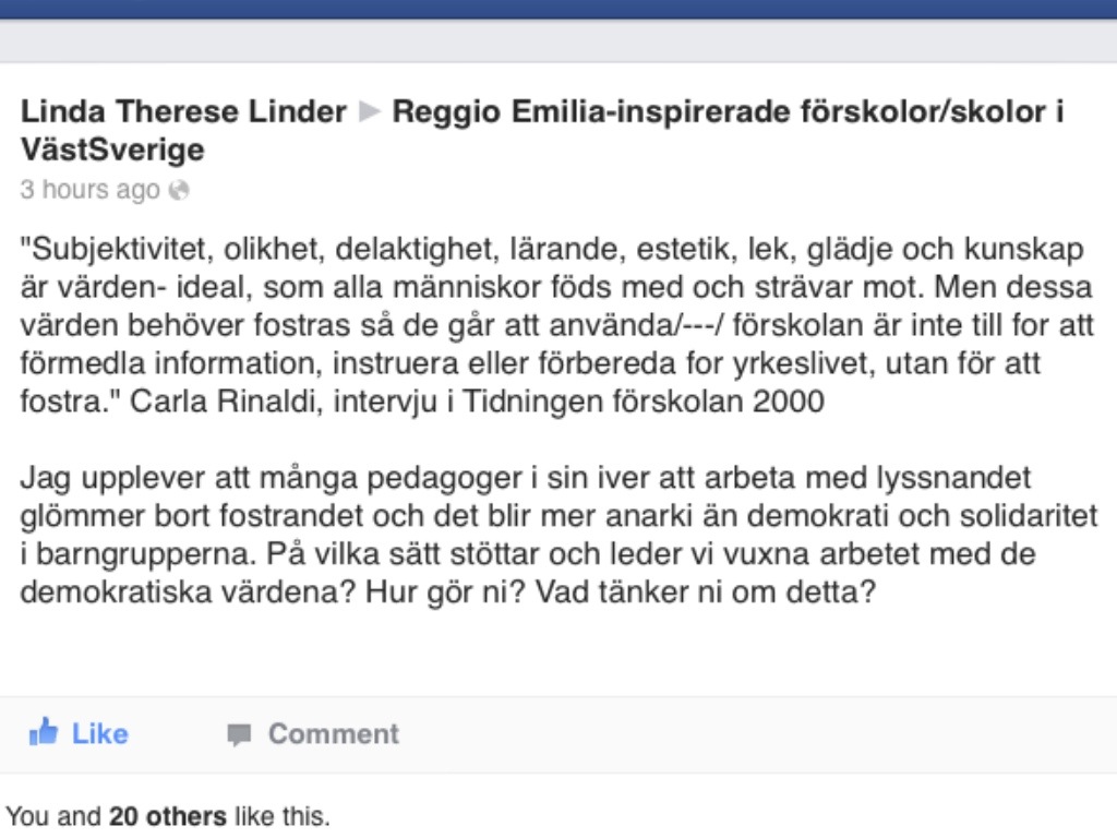 I sin jakt på ett demokratiskt förhållningssätt är det en fin gräns innan det går över till anarki – när barnets rätt att bestämma blir viktigare än att vara en del av ett kollektiv som fattar beslut tillsammans och respekterar varandra, och när det pedagogiska ledarskapet faller. I all välmening tänker man att barnen faktiskt har inflytande och bestämmer över sin egen vardag – men det handlar inte om demokrati. Som Carla skriver att demokrati är något som måste fostras. Jag tror att vi återigen hamnar i att plagiera något från Italien, i detta fall demokratiska värden, vi plagierar utan vare sig reflektion eller kritiskt tänkande. Missförstå mig rätt – självklart ska barnen få bestämma över sin vardag men jag har sett verksamheter där det faktiskt är barnen som bestämmer över pedagogerna, där barnen lämnas själva i att reda ut demokratibegreppet och där det inte har gått så bra – där gruppen består i första hand av starka individer (där de starkaste dikterar verksamheten) istället för en känsla av att vara en del av något större, ett kollektiv.