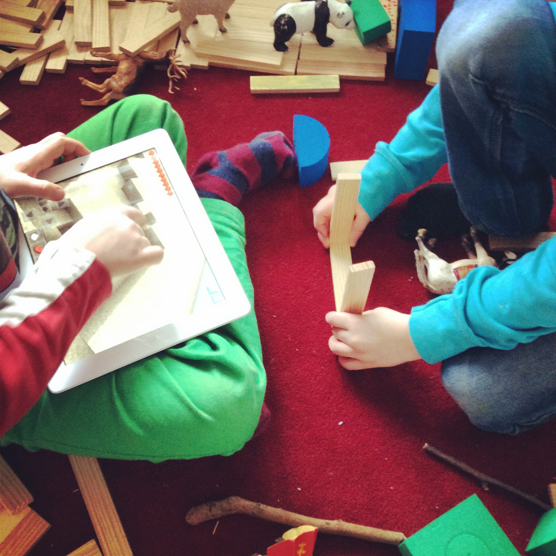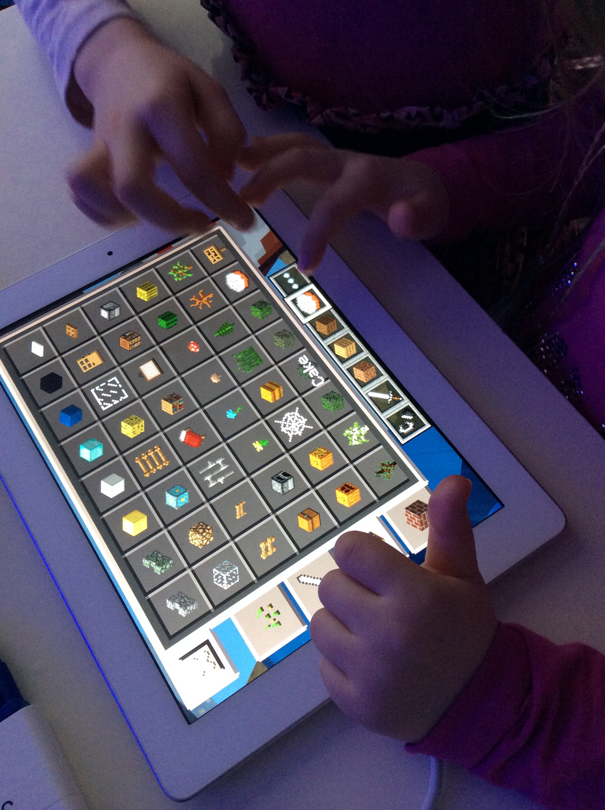 Vi laddar även ner spelet Minecraft och Toca Builders till vår lärplatta – något som säkert kan ses som lite provocerande men barnen spelar inte bara Minecraft – de arbetar med Minecraft. Att få vara runt barnen när de arbetar med spelet ger oss mer ingångar och ledtrådar, större möjlighet att fånga upp fler reflektioner barnen har kring Minecraft för att kunna fördjupa lärandet.