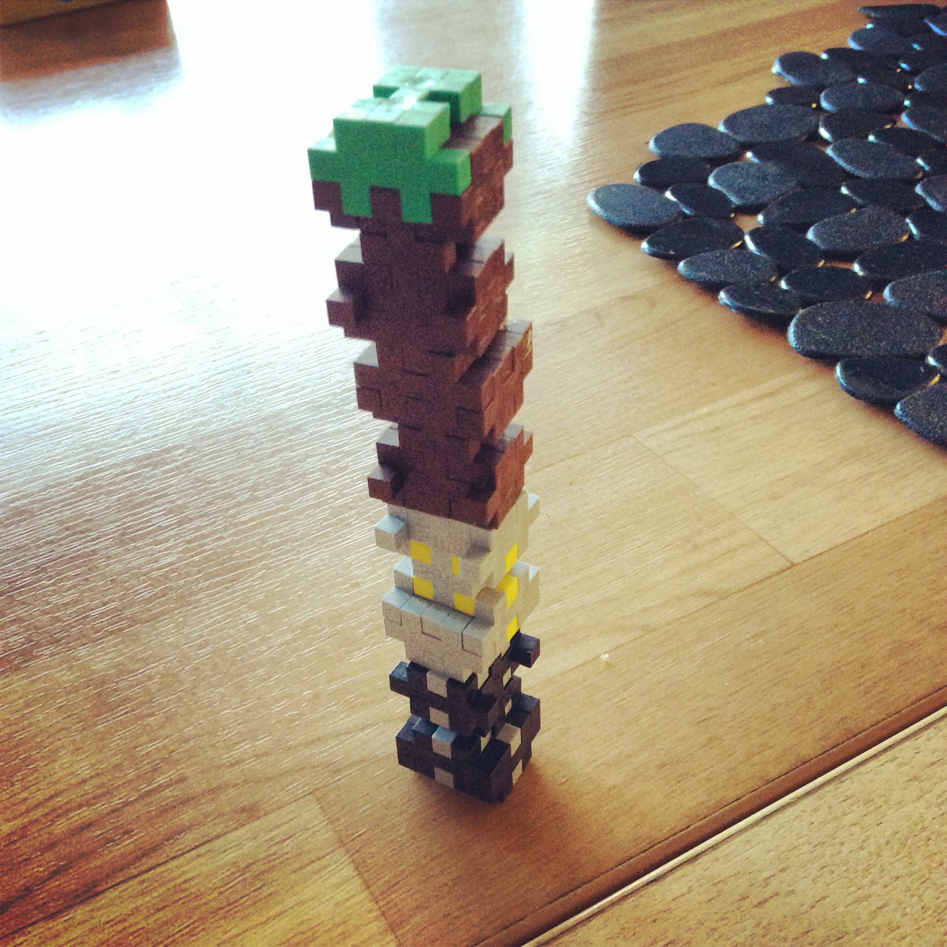 Vi reflekterar och vi ser att det händer en massa saker men det vi väljer att fokusera på är en reflektion som några barn haft kring vad som kommer under ett gräsblock, i samband med arbetet med plus plus. Barnen diskuterar kring block och funktion – återigen igen med en koppling till färger så vi reflekterar med en grupp barn om blocken och vi ser att de har en klar tanke om Minecrafts geologi. I relation till detta har vi sett att när de ”spelar” tycker de att det är spännande att spränga sig djupt ner i marken, så långt ner de kan komma, genom att använda TNT (dynamit). Genom att göra detta har de fått kännedom om vad som finns under jorden och under stenen. De kan stapla upp blocken utifrån i vilken ordning de kommer i Minecrafts jord.
