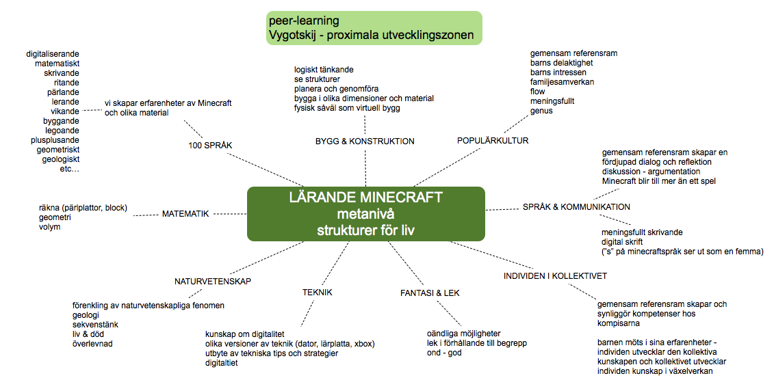 I allt detta letar vi efter en slags metanivå – alltså vad är det som de undersöker och försöker förstå i allt det här och vi har funnit att det återkommande handlar om identiteten och om strukturer för liv – i detta fall blir Minecraft ett verktyg för att undersöka detta, att undersöka sin omvärld.