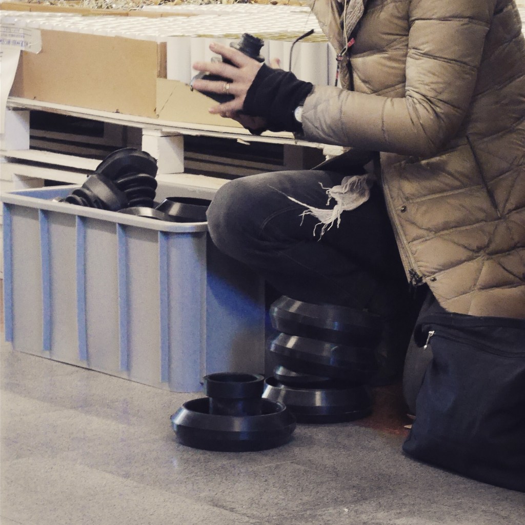 Jag slogs av, och fascinerades av hur hon utforskade materialet. Hon sökte svart material kunde man förstå. Hon testade att stapla och bygga med materialet, hon provade hur böjligt materialet var, hur det kunde passa in i varandra och hur det kunde användas. Det fanns en idé om vad hon letade efter. Hon tog heller inte en hög av materialet. Hon tog sparsamt.