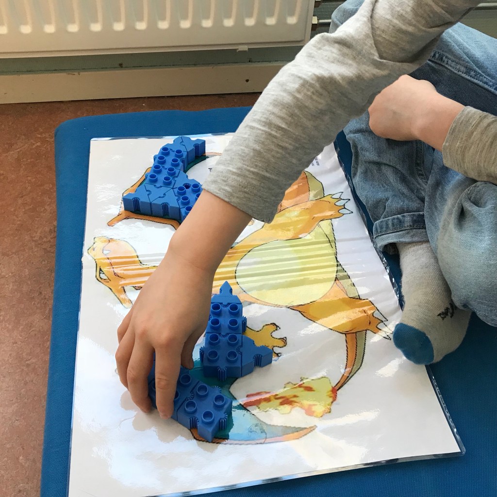 För min del fick jag möjligheten att följa ett barns byggprocess för att återskapa Pokemonen Charizard. I dialog med barnet framkommer att det som gör att hen vill bygga just Charizard är för att den kan utvecklas två gånger, den är stark, den har vingar och för att den kan använda både vatten och eld. Jag känner mig som en novis för jag alldeles för dålig koll på Pokemons men en av pedagogerna som leder aktiviteten har full koll vilket märks på barnen som vänder sig särskilt till denna pedagog.
