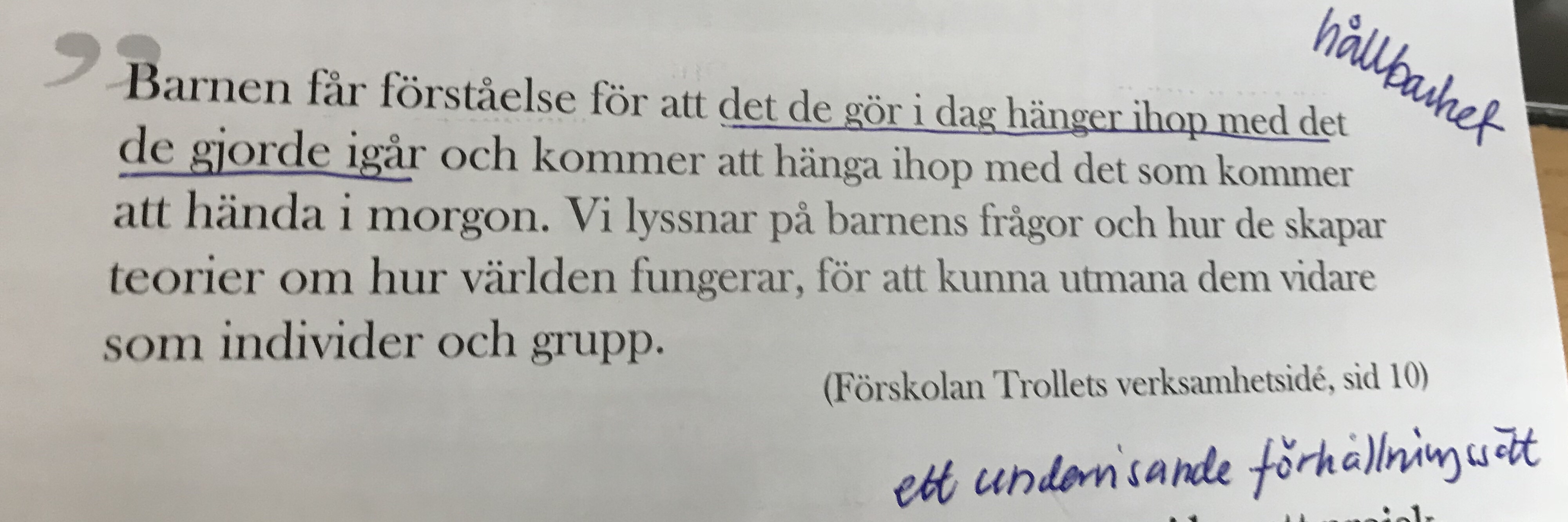 Linda Linder myntade, under SETT-dagarna i Stockholm, ett begrepp i alla fall inte jag hört tidigare – ett undervisande förhållningssätt. Ju mer jag tänker på det desto mer gillar jag det! Snarare än undervisning, som vi lätt förknippar med den traditionella förmedlingen, så kommer här ett begrepp som för mig blir mer naturligt i munnen och och i tanke. Begreppet kan jämföras med ett projekterande förhållningssätt som alltmer förekommer i Reggio Emilia inspirerade verksamheter utifrån det italienska begreppet ”progettazione”. Ett undervisande förhållningssätt bär med sig tanken om lärande över hela dagen snarare än under en avgränsad projekttid och aktivitet. Begreppet undervisande förhållningssätt öppnar också upp för en flerstämmighet snarare än förknippat med en kunskapssyn som projekterandebegreppet är. Men vi måste stöta begreppet mot den egna verksamheten – vad skulle i så fall ett undervisande förhållningssätt betyda för oss?