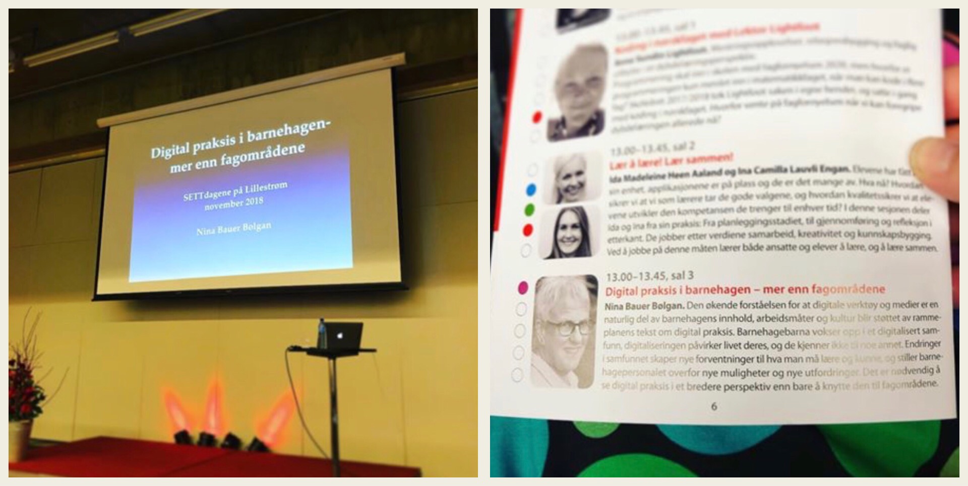 I hennes föreläsning lyfte hon till exempel en viss kritik mot att Rammeplanen (2017) som är Norges motsvarighet till vår läroplan. Hon menade att det är synd att ”Digital praxis” (som är ett kapitel i Rammeplanen) fick en egen del nästan som att det digitala är något som ligger utöver det andra. Jag tänker på processen inför LPFÖ18 där det digitala också inledningsvis var ett tillägg till LPFÖ98/16 innan man bestämde sig för att arbeta om läroplanen. Nina lyfte att Sverige är ett föredöme för Norge i arbetet med digitala verktyg. Till exempel med Multimediabyrån och den nationella satsningen PIM. Hon lyfte också Skolverkets webbkurs ”Identitiet, jämställdhet och digitalisering” som startades upp igår och det viktiga att kompetensutvecklingen kommer INNAN skarpt läge med läroplanen så att pedagogerna får en möjlighet att kompetensutveckla sig innan det ska ske i praktiken.