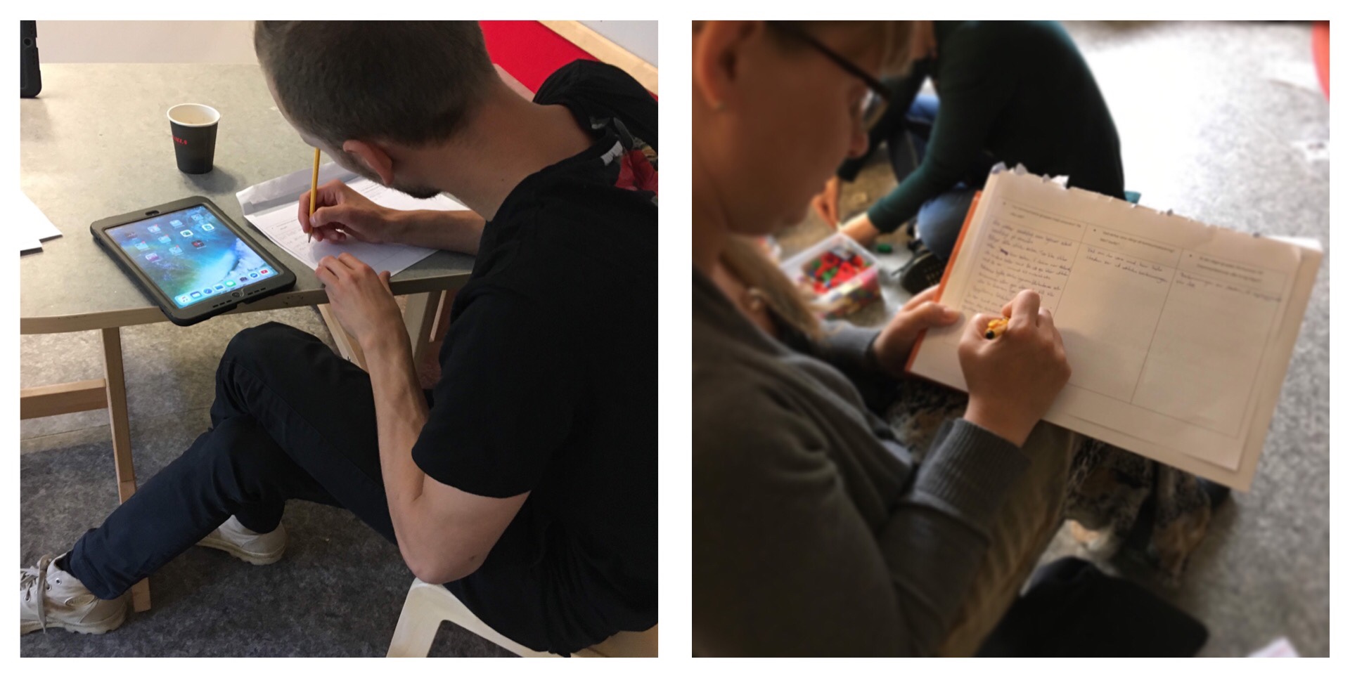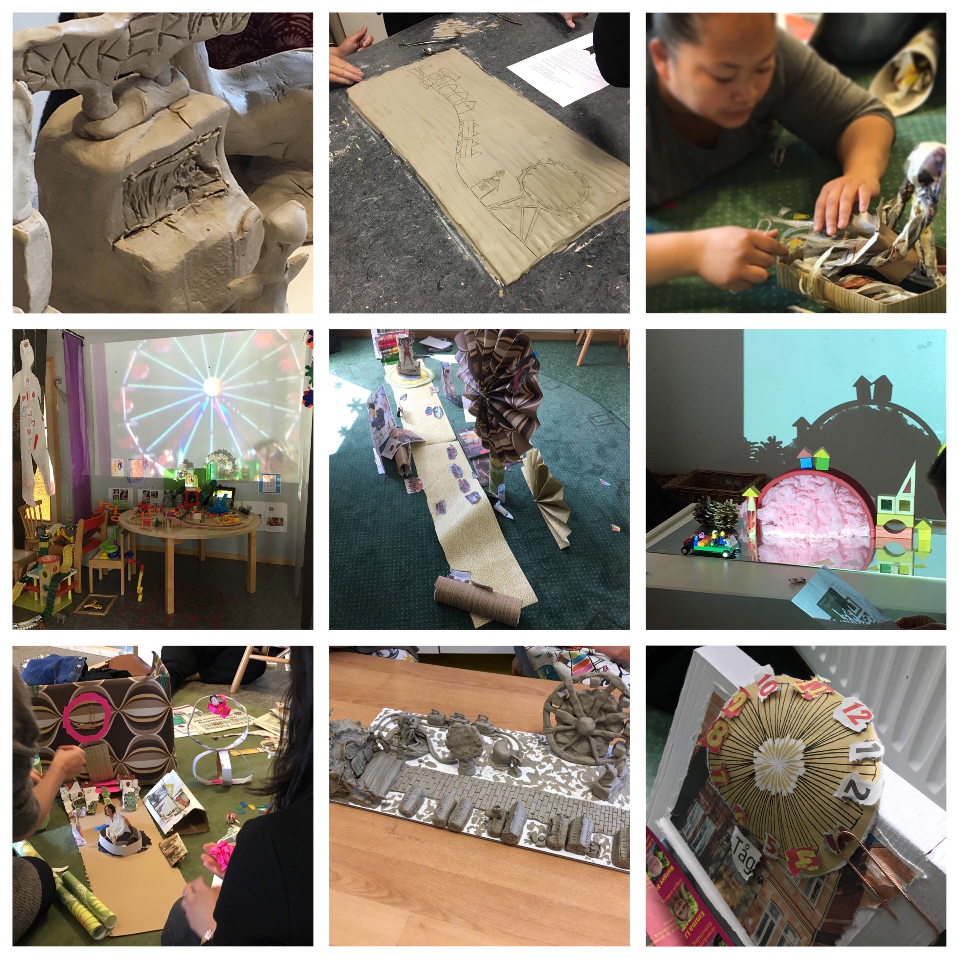 Sedan kom vi till eftermiddagen som jag var mer ansvarig för. Vi inledde med en workshop där pedagogerna i sina arbetslag fick i uppgift att återskapa en stad i olika uttryck. Några i lera, några med digitala verktyg och några med papper/gem. En pedagog i varje arbetslag observerade och dokumenterade också sina kollegor utifrån tre givna frågor (inspirerade av Ann Åberg).