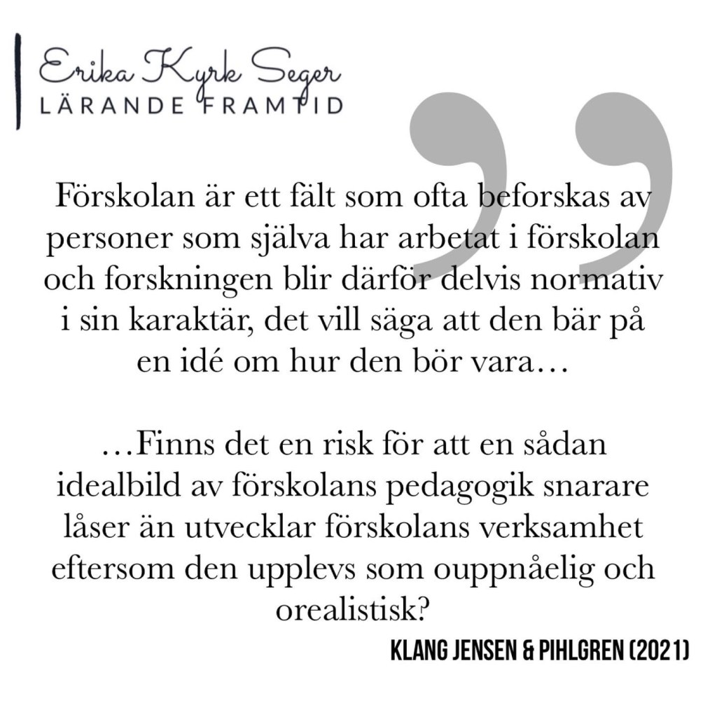 Inleder terminen med en intressant input från Klang Jensen och Pihlgren (2021). De menar att den största delen av förskoleforskning byggs upp av personer som varit verksamma i förskolan samt att den utförs framförallt med högskoleutbildade förskollärare som underlag och att det ur detta framträder en idealbild som inte representerar realiteten – varken ur kompetens- eller bemanningsperspektiv (förskollärarbrist).