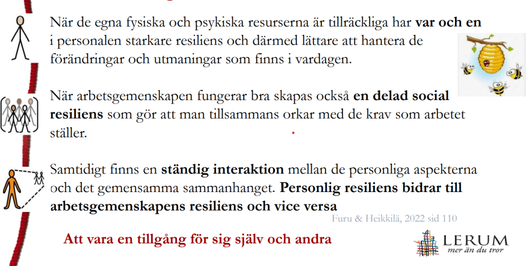 Men kontentan någonstans i våra reflektioner var att vi i våra verksamheter har alla dessa tre perspektiv och hur påverkar det i SIN tur att stödja utvecklandet av resiliens i våra barngrupper, hos våra barn. Hur kan man bygga resiliens om man själv inte har det? Och hur kan vi som chefer leda, skapa förutsättningar och stöd för att resiliens ska växa fram? Och var går gränsen för chefskapet och egenansvaret? Så många frågor, så många tankar och så lite svar…