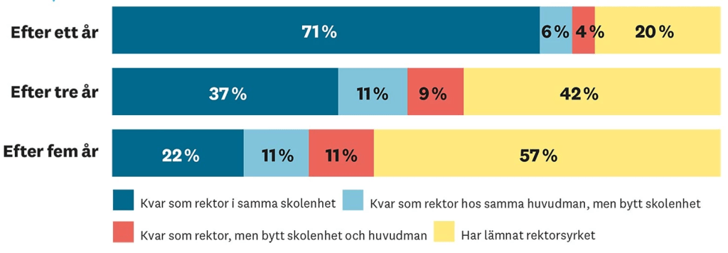 En sak som jag också märkt är att det är ganska tyst om rektors arbetsmiljö med rektorers egna ord på sociala medier. Jag möter mer om pedagogernas arbetsmiljö. Studier för rektorns arbetsmiljö finns, underlag finns. Kanske behöver jag följa fler rektorer men jag ser inte de här dilemmana, som jag lyfter, på sociala medier. Det finns en skyddande och tyst kultur i rektorsskrået av rädsla för att yttra sig så att man utelämnar pedagoger, organisation och sig själv. Jag är en delande person, ganska transparent men det är också för att jag innerst inne tänker att om vi delar det svåra så blir det inte så svårt. Förståelse kan läka mycket av missförstånd. När man inte förstår eller ser det egna svåra hos någon annan kan man känna sig ensam. Och ett chefskap är ensamt på många sätt även om man har människor runt sig. Visste ni till exempel att många rektorer flyr yrket? (bild från denna artikel). Nedanstående bild visar på grundskole- och gymnasierektorer men hur ser det ut för förskolerektorer?