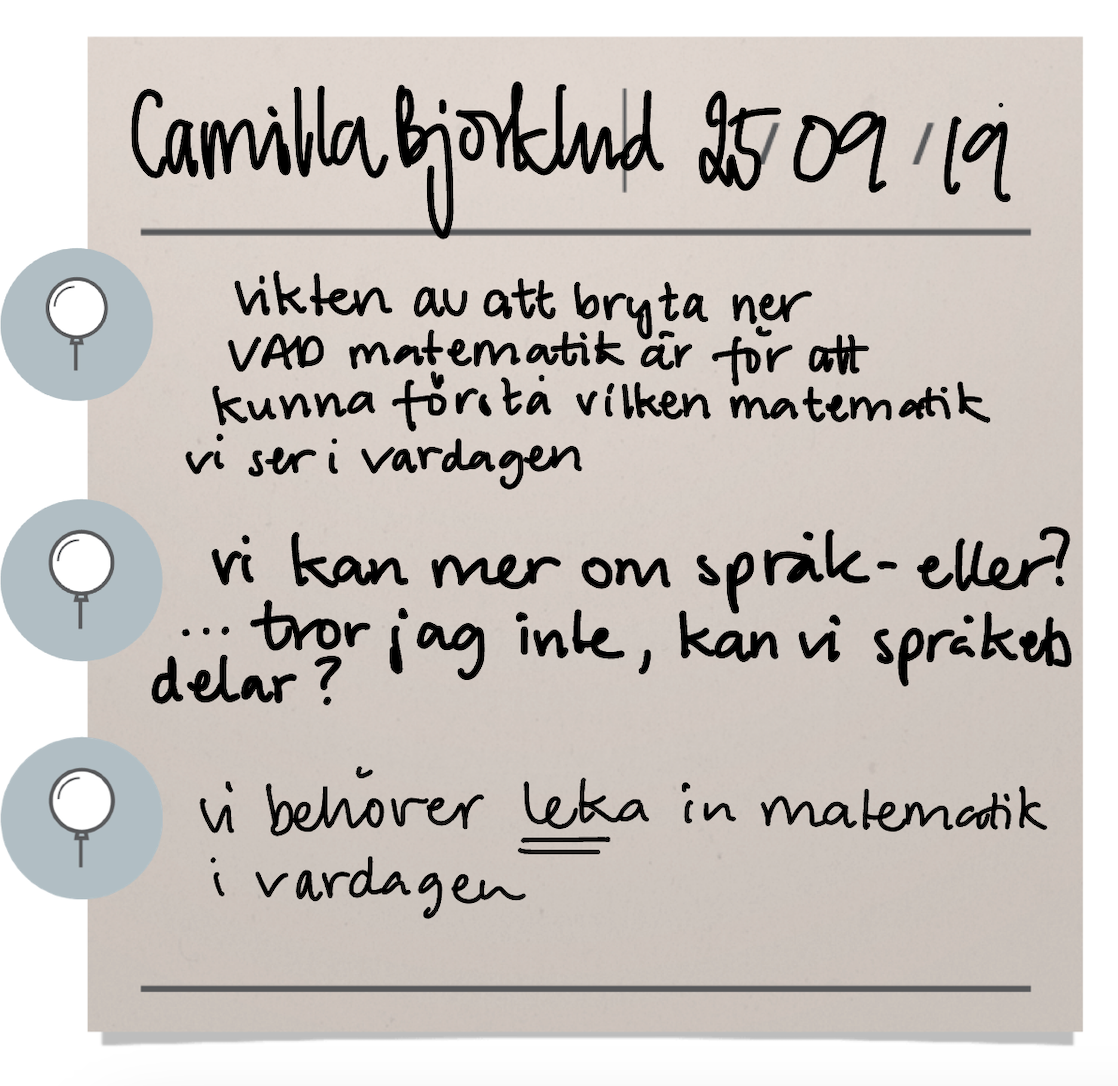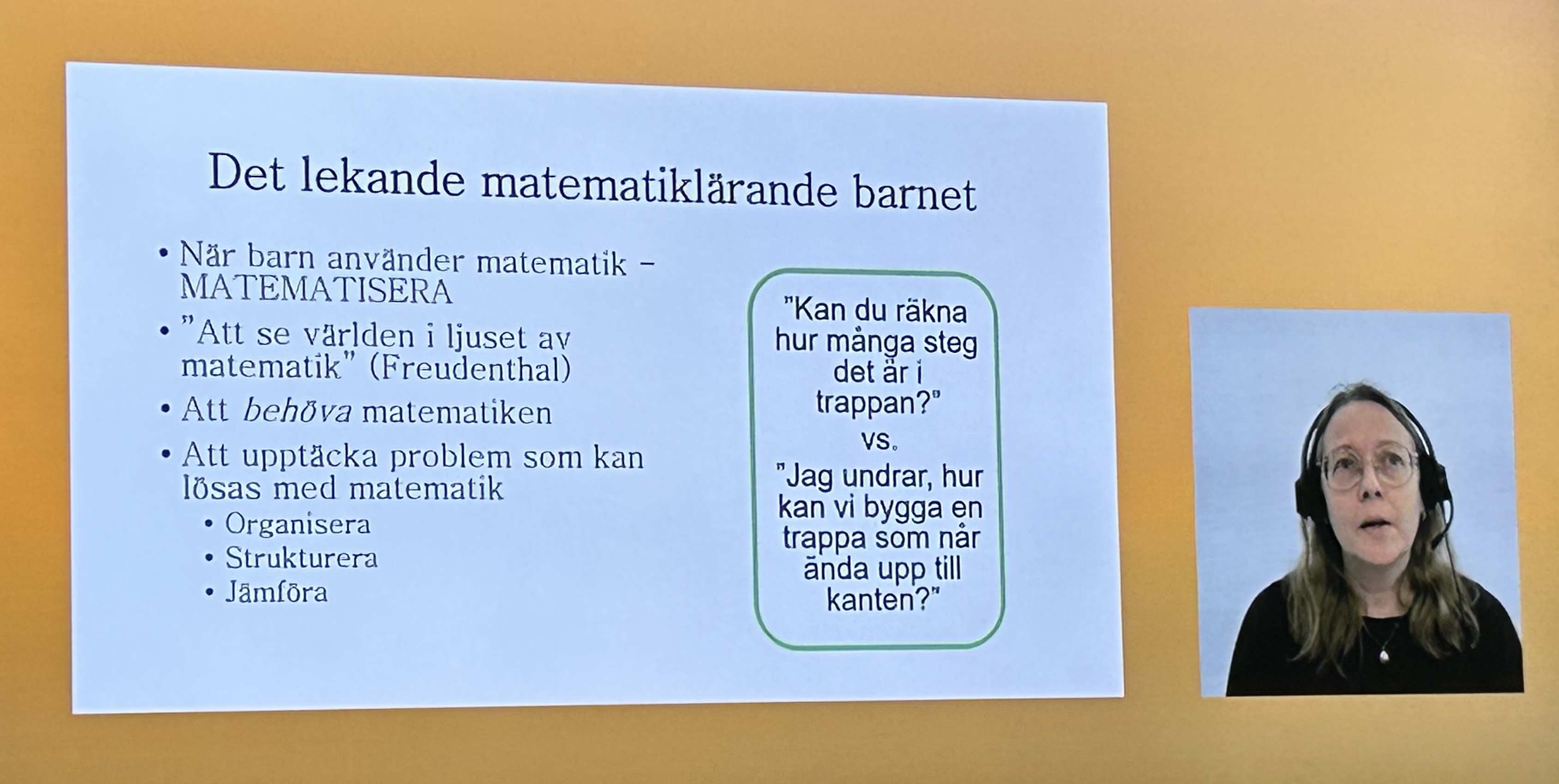 Vi fick också lyssna till mer ämnesspecifika föreläsningar: Camilla Björklund fokuserade på matematik och Johan Boström på teknik. Föreläsningarna var väldigt hands on och konkreta. För mig väcker det en oro: hur säkerställer vi att all denna kunskap finns i varje arbetslag? När Camilla ger ett talande exempel på hur pedagoger i en matematisk aktivitet – i all välmening – kan ställa till det för barnen med ett mer lustfyllt sätt att räkna, och visar att det hade varit enklare för barnen att förstå om man använt en färg. Och den ständiga frågan om att förstå skillnaden mellan tal och mängd. Vi behöver kompetenskartlägga och utbilda så att barnen omges av personal med spetskompetens.