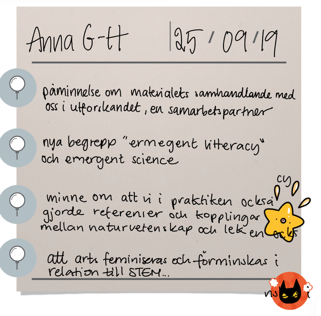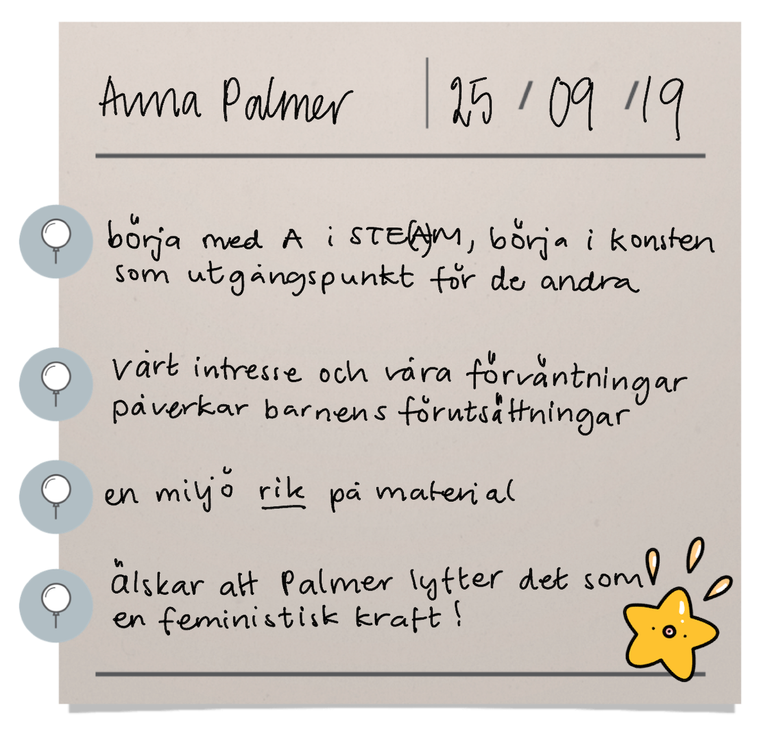 Anna Günther-Hanssen visade också på normerna inom bokstaven A: att estetiska former ofta är feminint kodade, vilket får konsekvenser. STEM anses viktigare än A:et… grrr! A:et förminskas till ett hjälpämne när det borde vara ett hjärtämne. Så skärpning! Jag tänker att detta förstärker bilden av att det feminina inte hör ihop, att flickor inte hör till – när det borde vara precis tvärtom.
