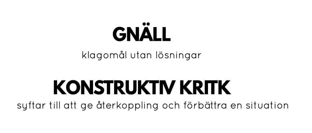 Det är viktigt att lyfta skillnaden på gnäll och konstruktiv kritik. Som människor hamnar vi lätt i att se på det som inte fungerar och lägga över lösningar och fixandet på andra då det krävs en viss ansträngning och ansvarstagande av oss själva för förändring och för att bidra till att komma vidare. Det är också en del av det där med att känna sig hjälplös – ”jag kan väl inte påverka det här”. Här är vi också olika som människor men vi kan alla träna på att hjälpas åt att göra saker bättre. Det kan bli ganska dränerande om man fastnar i tanken av att inte kunna påverka eller att man är just maktlös.
