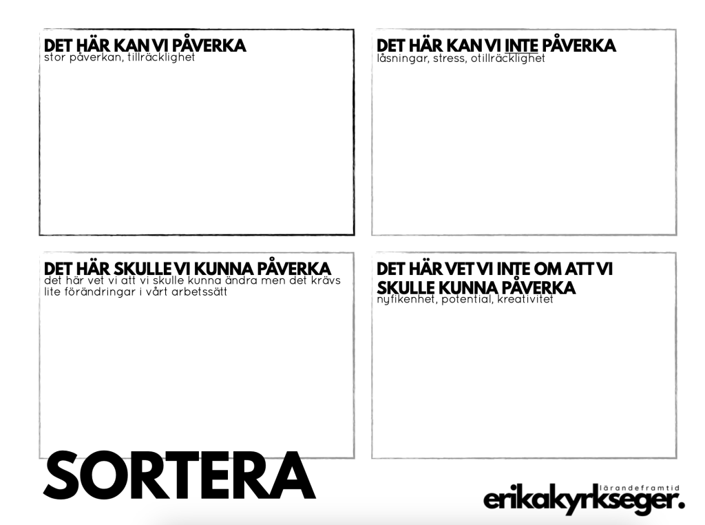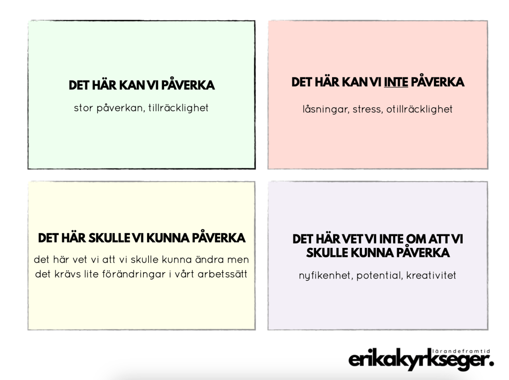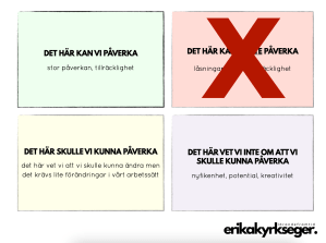 Nu har du/ni en massa lappar med saker som skaver eller gör just dig frustrerad. Nu ska vi sortera dessa i fyra fält och efter vår egen påverkansgrad. Se bilden nedan.